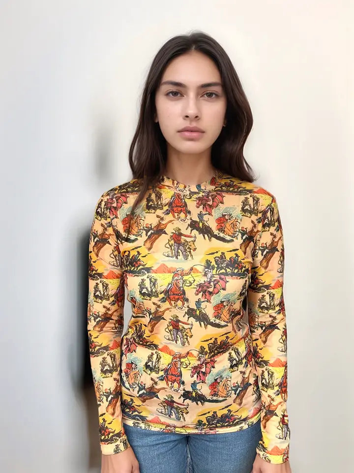 This is one of our favorite prints. The Vintage Cowboy on a Long Sleeve Mesh Top... Great for layering and wearing for a night out at the Rodeo or just around town. Dress up or wear for everyday casual, cool & comfortable.